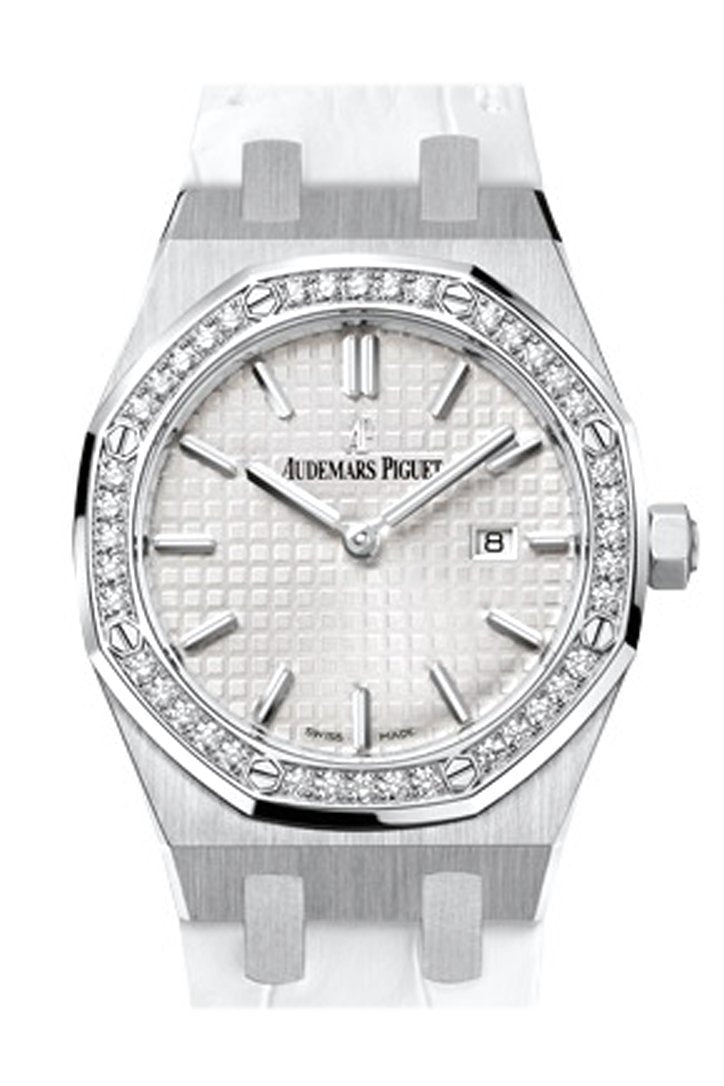 Stainless steel case with a white alligator leather strap. Fixed bezel set with 40 brilliant-cut diamonds (0.71 ctw). Silvered dial with silver-tone hands and stick hour markers. Dial Type: Analog. Luminescent hands and markers. Date display at the 3 o'clock position. Quartz movement. Calibre 2713 engine. Scratch resistant sapphire crystal. Solid case back. Case diameter: 33 mm. Case thickness: 7 mm. Octagon case shape. Deployment clasp with push button. Water resistant at 50 meters / 165 feet. Functions: date, hour, minute, second. Luxury watch style. Watch label: Swiss Made. Audemars Piguet Royal Oak Diamond Stainless Steel Ladies Watch 67651ST.ZZ.D010CR.01.