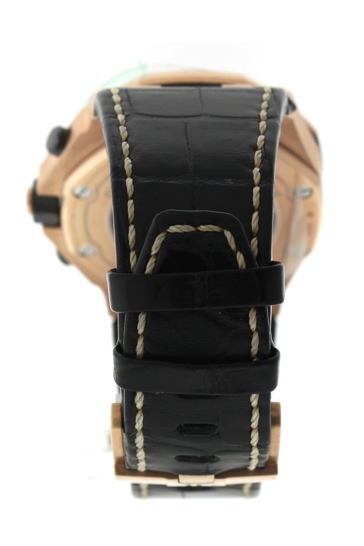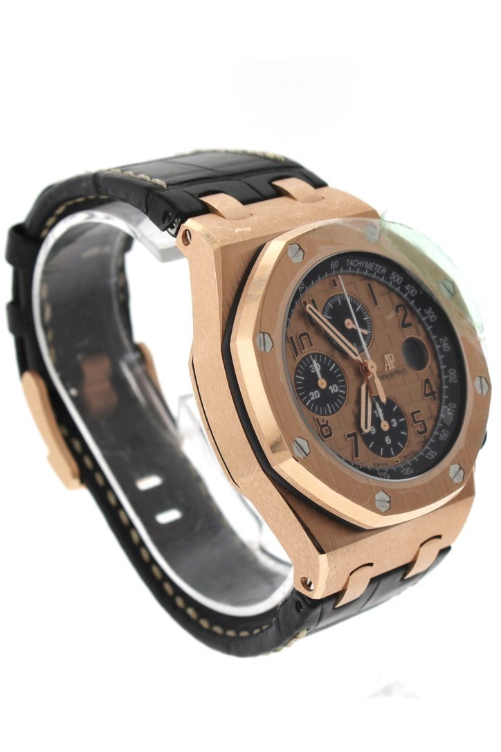 18kt pink gold case with a black alligator leather strap. Fixed bezel. Champagne dial with gold-toned hands and Arabic hour markers. Tachymeter scale appears around the outer rim. Dial Type: Analog. Date display at the 3 o'clock position. Chronograph - sub-dials displaying: three - 60 second, 30 minute and 12 hour. Automatic movement. Scratch resistant sapphire crystal. Case diameter: 42 mm. Case thickness: 14.54 mm. Round case shape. Water resistant at 100 meters / 330 feet. Functions: chronograph, date, hour, minute, second. Luxury watch style. Watch label: Swiss Made. Audemars Piguet Royal Oak Offshore 18kt Pink Gold Automatic Mens Watch 26470OROOA002CR01