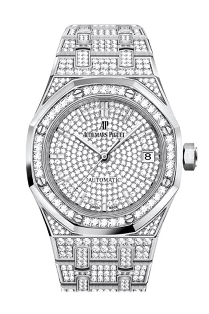 Audemars Piguet Watches - Royal Oak Self Winding 37mm - White Gold - Style No: 15452BC.ZZ.1258BC.01 37 mm 18K white gold case set with 860 brilliant-cut diamonds (includes bracelet), 9.8 mm thick, 18K white gold dial set with 275 brilliant-cut diamonds and 25 baguette-cut diamond hour markers, Calibre 3120 selfwinding movement with hours, minutes, center seconds and date, approximately 60 hours of power reserve, 18K white gold diamond bracelet, AP folding buckle. Water resistant to 50 m.