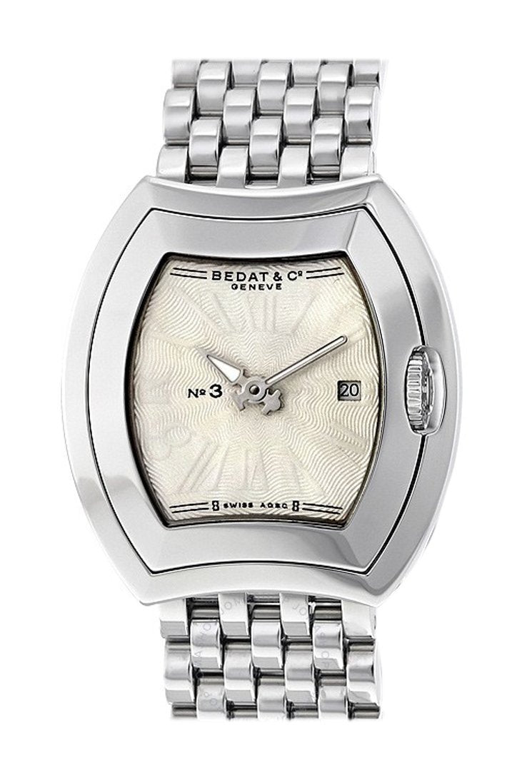 Stainless steel case with a stainless steel bracelet. Fixed stainless steel bezel. Silver dial with luminous silver-tone hands. No markers. Dial Type: Analog. Date display at the 3 o'clock position. Quartz movement. Scratch resistant sapphire crystal. Push / pull crown. Solid case back. Case dimensions: 29 mm x 31 mm. Case thickness: 6.5 mm. Tonneau case shape. Band width: 18 mm. Band length: 7 inches. Hidden folding clasp. Water resistant at 50 meters / 165 feet. Functions: date, hour, minute, second. Luxury watch style. Watch label: Swiss A.O.S.C. Item Variations: 334 011 100, 334-011-100, 334/011/100, 334011100. Bedat No 3 Silver Dial Stainless Steel Ladies Watch 334.011.100