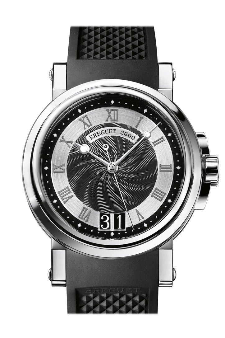 Stainless steel case with a black rubber strap. Fixed stainless steel bezel. Black dial with silver-tone hands and Roman numeral hour markers. Minute markers around the outer rim. Dial Type: Analog. Date display at the 6 o'clock position. Automatic movement with a 65-hour power reserve. Scratch resistant sapphire crystal. Screw down crown. Transparent case back. Case diameter: 39 mm. Case thickness: 12 mm. Round case shape. Deployment clasp. Water resistant at 100 meters / 330 feet. Functions: date, hour, minute, second. Luxury watch style. Breguet Marine Automatic Black Dial Black Rubber Strap Mens Watch 5817ST925V8