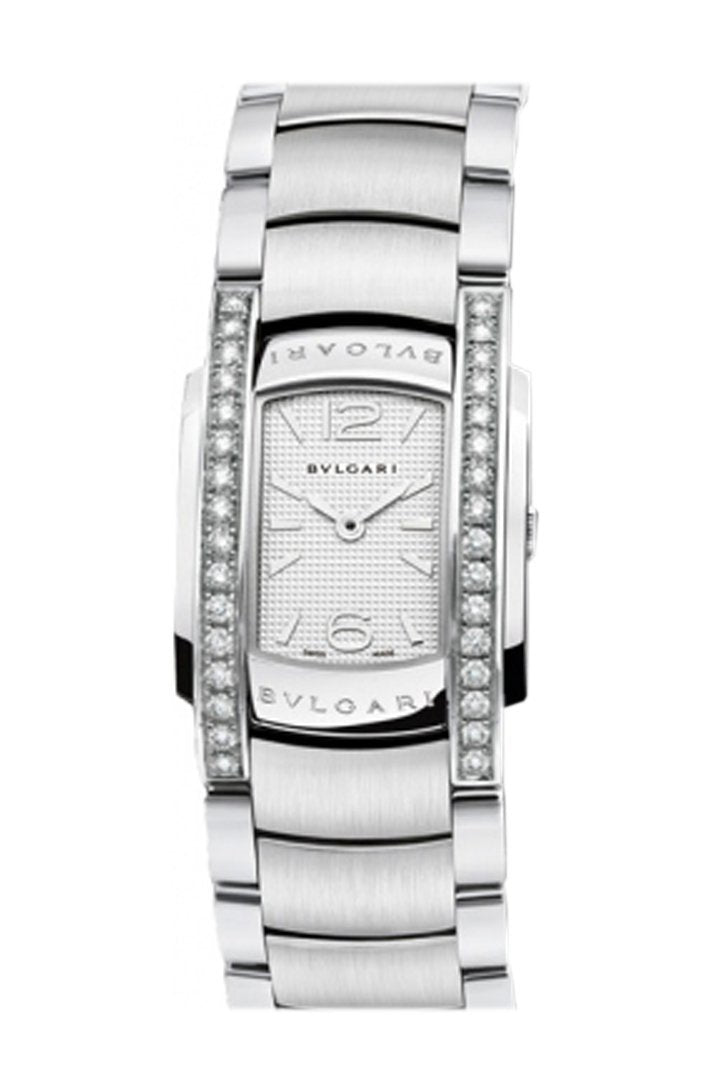 Stainless steel case with a stainless steel bracelet. Fixed set with diamonds bezel. Silver dial with silver-tone hands and Arabic numeral and index hour markers. Dial Type: Analog. Quartz movement. Scratch resistant sapphire crystal. Solid case back. Case size: 35 mm. Rectangle case shape. Deployment with push button clasp. Water resistant at 30 meters / 100 feet. Functions: hour, minute. Luxury watch style. Watch label: Swiss Made. Bvlgari Assioma Silver Dial Stainless Steel Ladies Watch AA35C6SDS.
