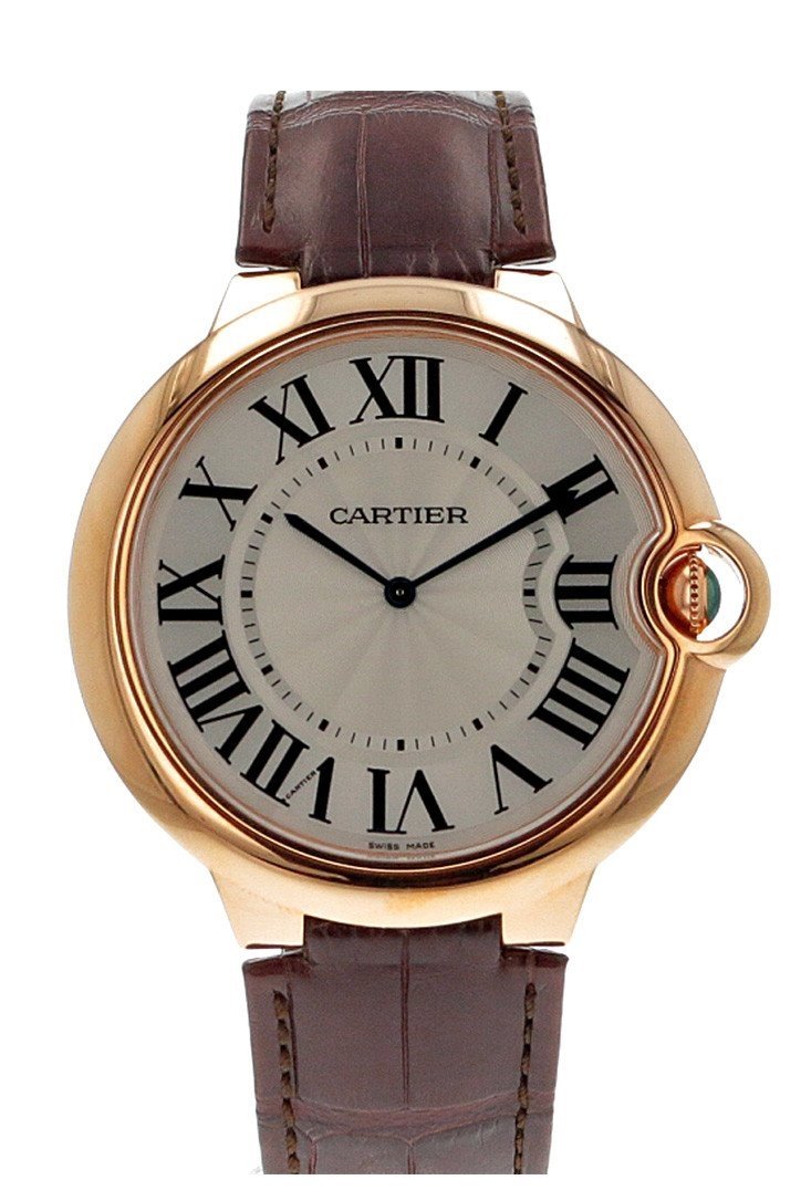 18kt rose gold case with a brown alligator leather strap. Fixed 18kt rose gold bezel. Silver dial with blued steel hands and Roman numeral hour markers. Minute markers around the inner ring. Dial Type: Analog. Mechanical movement. Scratch resistant sapphire crystal. 18kt rose gold fluted crown set with a blue sapphire cabochon. Solid case back. Case diameter: 46 mm. Case thickness: 7.05 mm. Double adjusting deployment clasp. Water resistant at 30 meters/ 100 feet. Functions: hours, minutes. Luxury watch style. Watch label: Swiss Made. Cartier Ballon Bleu Extra Large Silver Dial 18kt Rose Gold Leather Mens Watch W6920054.