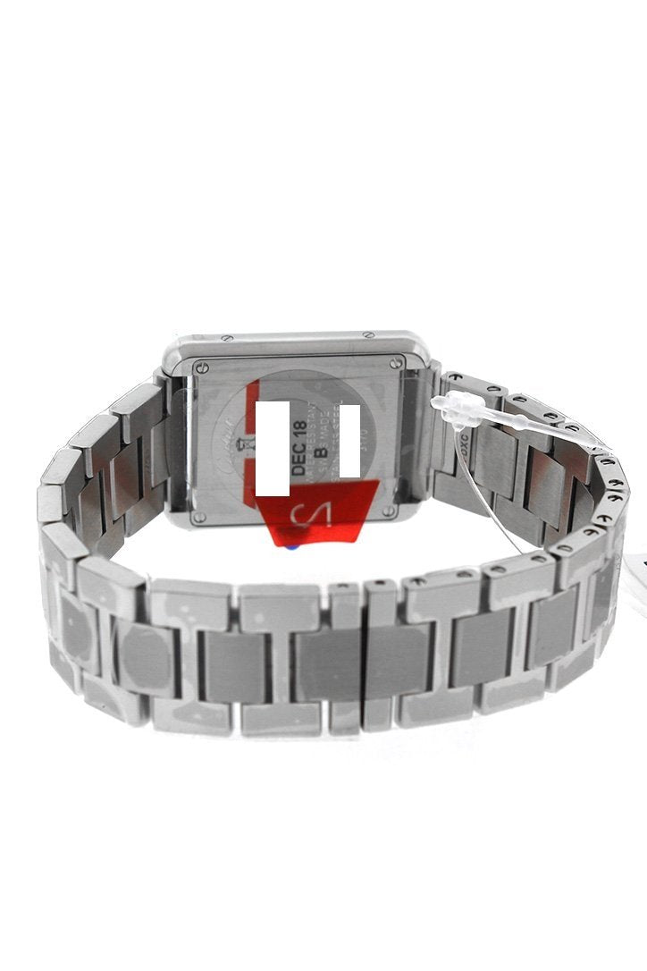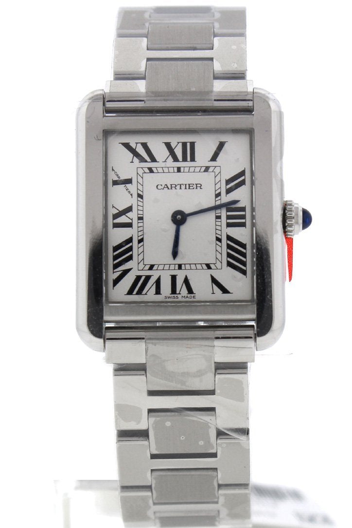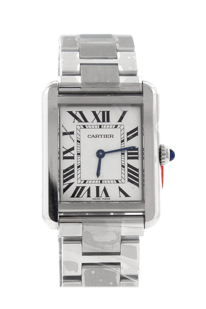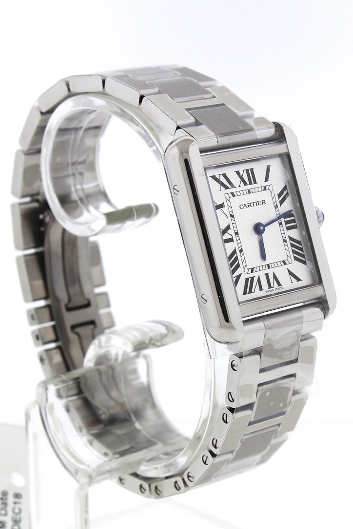 Stainless steel case with a stainless steel bracelet. Fixed stainless steel bezel. Silver opalined dial with sword-shaped blue hands and black Roman numeral hour markers. Minute markers around the inner ring. Dial Type: Analog. Luminescent hands and dial markers. Quartz movement. Scratch resistant sapphire crystal. Pull / push crown. Solid case back. Case dimensions: 31 mm x 24 mm. Case thickness: 5.55 mm. Square case shape. Band width: 16 mm. Deployment clasp. Water resistant at 30 meters / 100 feet. Functions: hours, minutes. Luxury watch style. Watch label: Swiss Made. Cartier Tank Solo Small Watch W5200013