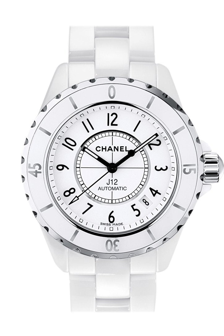 White ceramic case with a white ceramic bracelet. Unidirectional rotating stainless steel bezel with a white ceramic inlay. White dial with luminous black hands and black Arabic numeral hour markers. Minute markers on the outer rim. Luminescent hands and dial markers. Date display between the 4 and 5 o'clock positions. Automatic movement with a 42-hour power reserve. Scratch resistant sapphire crystal. Screw down crown. Solid case back. Case diameter: 38 mm. Case thickness: 11mm. Hidden deployment clasp. Water resistant at 200 meters / 660 feet. Functions: hours, minutes, seconds, date. Chanel J12 White Automatic White Dial White Ceramic Watch H0970