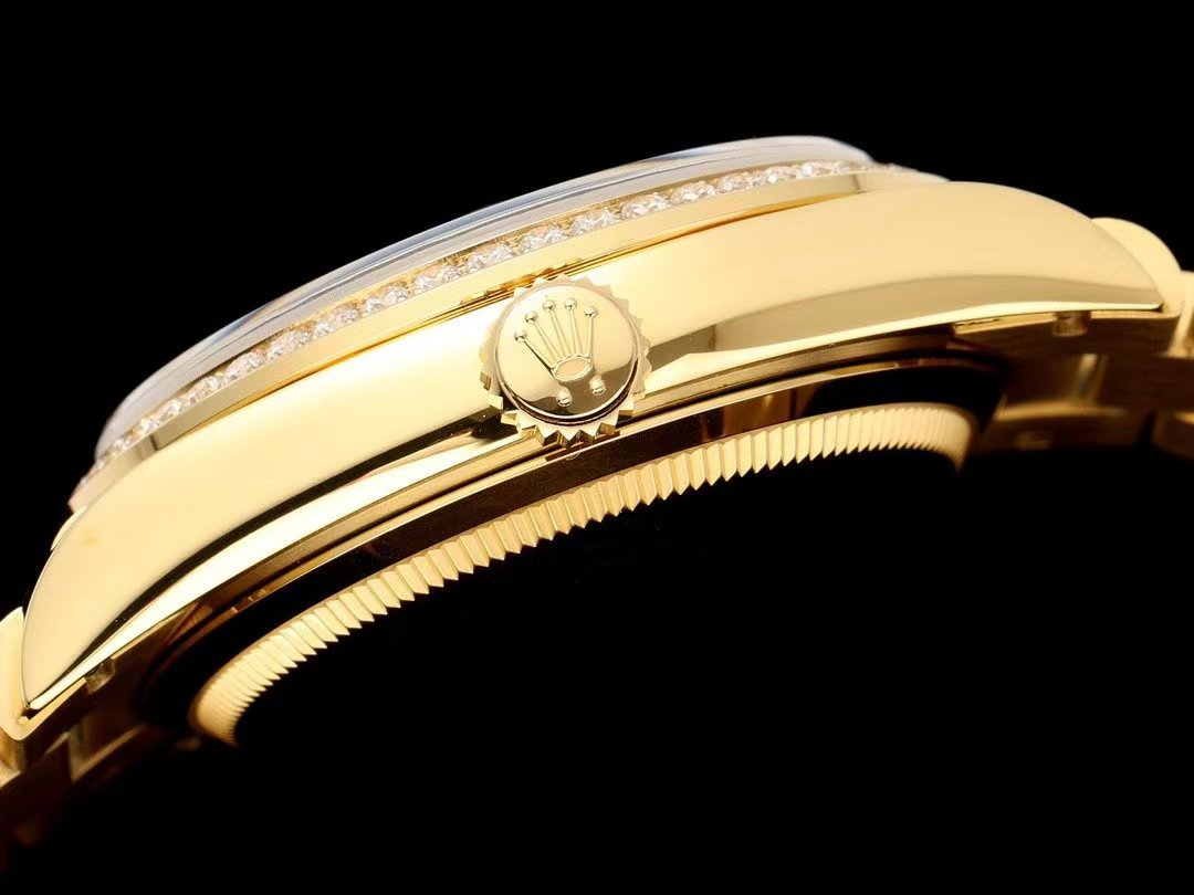 Rolex Yellow Gold Day-Date 36 Watch - Diamond Bezel - Carnelian Dial - President Bracelet 36mm 18K yellow gold case, screw-down back, screw-down crown with twinlock double waterproofness system, bezel set with 52 diamonds, scratch-resistant sapphire crystal with cyclops lens over the date, Carnelian dial, Roman Diamond hour markers, Rolex calibre 3255 perpetual self-winding movement with centre hour, minute and seconds hands, instantaneous day and date in apertures, unrestricted rapid-setting, and stop-seconds for precise time setting, approximately 70 hours of power reserve, 18K yellow gold President bracelet with semi-circular three-piece links, concealed folding Crownclasp buckle. New Release Model 2023 Waterproof to 100 meters. 128238 128238-0088
