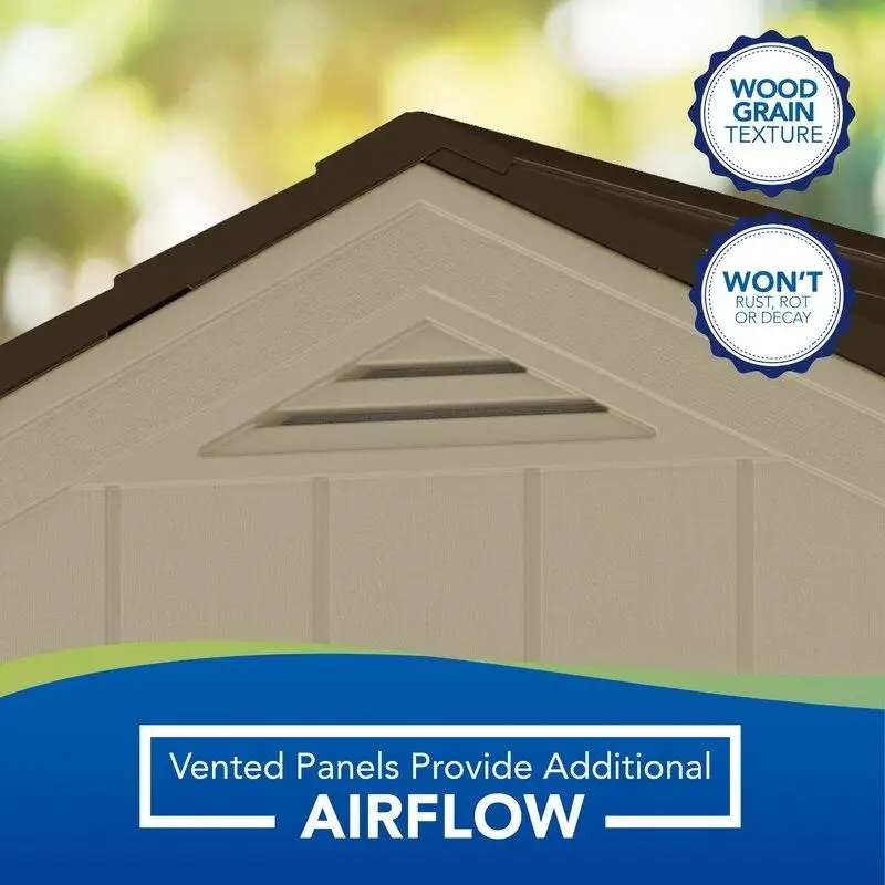Want to get rid of clutter in your outdoor space? These are 201 cubes. ft. An outdoor storage shed is your best defense for organization in any season. Double door entry and 6ft x 6ft dimensions make it ideal for accommodating all large equipment. Smaller items and everyday essentials can also be easily organized with an optional accessory kit, and skylights and doors and windows bring in plenty of natural light. Designed for strength and stability, this shed does double duty with its multi-layered resin and padlock handles to stylishly protect your valuables.