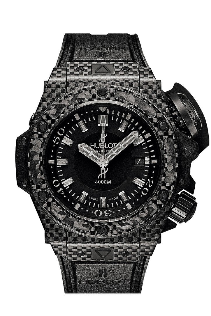 Hublot Big Bang King 48mm Power Oceanographic LIMITED EDITION Men's Watch 731.QX.1140.RX Hublot Big Bang King Power Oceanographic 4000 Watch Hublot Watches - Big Bang King Power 48mm Oceanographic 4000 - Style No: 731.QX.1140.RX 48mm carbon fiber case, carbon fiber bezel, mat black dial, self winding HUB 1400 movement, approximately 42 hours of power reserve, black rubber strap with deployant buckle. Water resistant to 4000 meters.
