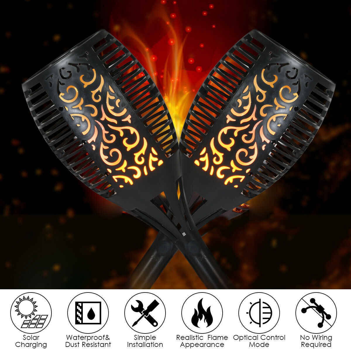 ● Simple Installation and Easy to Use: The installation of these solar flame torches light is very simple and does not require other auxiliary tools. No wiring is required just plug the solar light into the ground or install it anywhere you want and enjoy that bright warm lighting.