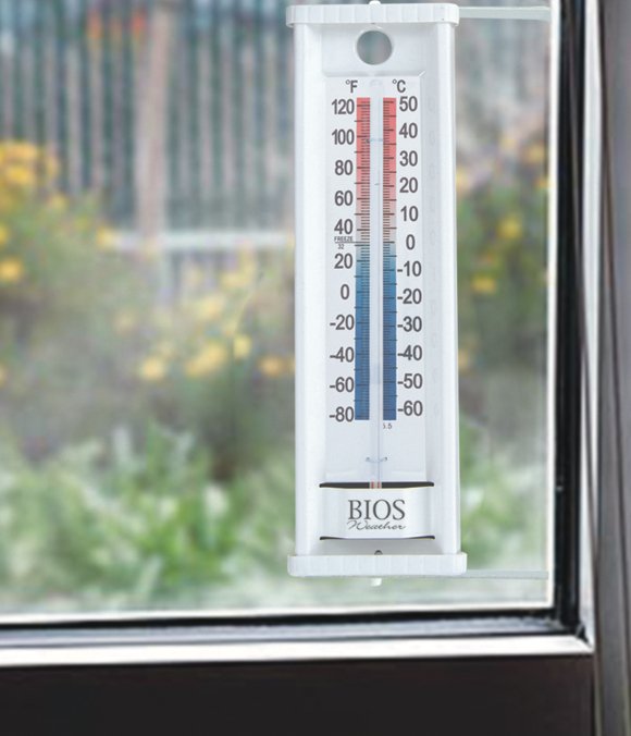 This weatherproof aluminum thermometer can be affixed to a window or wall.