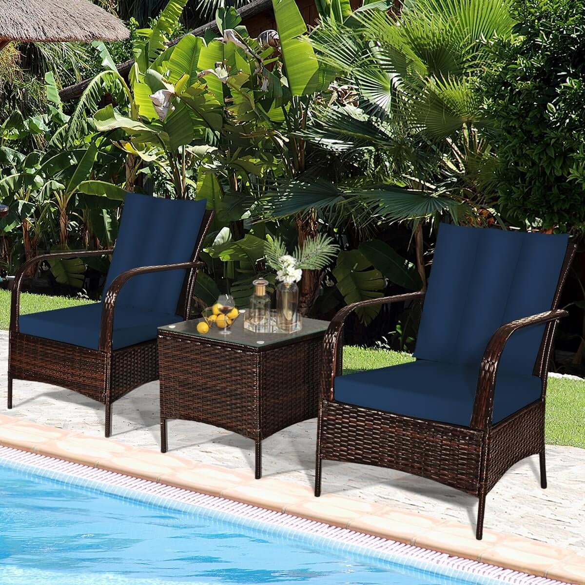 3 Pcs Patio Conversation Rattan Furniture Set with Glass Top Coffee Table and Cushions-Navy