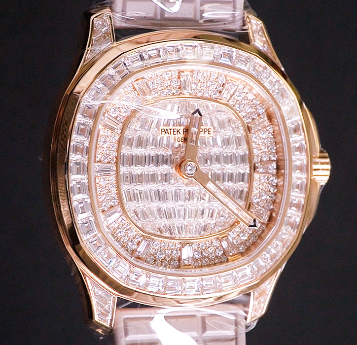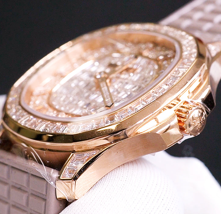 Patek Philippe Aquanaut Luce Haute Joaillerie Diamond Bezel 5062/450R Self-winding mechanical movement. Caliber 324. Aquanaut Luce Haute Joaillerie. Dial set with 160 brilliant-cut diamonds (~0.68 ct) (snow setting) and 76 baguette diamonds (~2.6 ct) (invisible setting), 12 baguette diamond hour markers (~0.53 ct). 18K gold dial plate. Rose gold. Screw-down crown. Sapphire-crystal case back. Water-resistant to 30m. Case diameter (10 – 4 o’clock): 38.8 mm. Bezel and lugs set with 48 baguette diamonds (~3.68 ct). Hands set with 6 baguette diamonds (~0.06 ct) and one brilliant-cut diamond (~0.01 ct). Aquanaut fold-over clasp set with 10 baguette diamonds (~0.34 ct). “Tropical” composite strap, pearly beige. Aquanaut fold-over clasp set with 10 baguette diamonds (~0.34 ct).