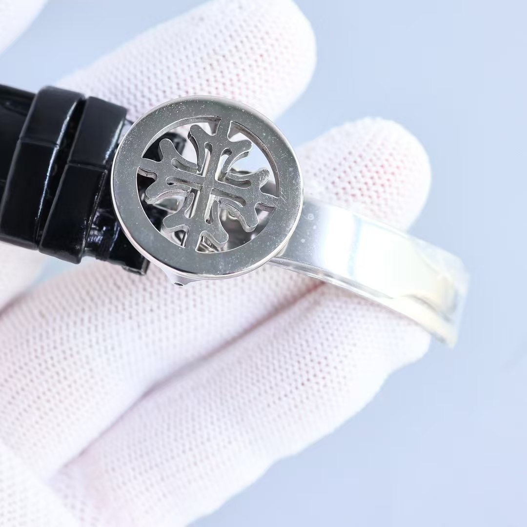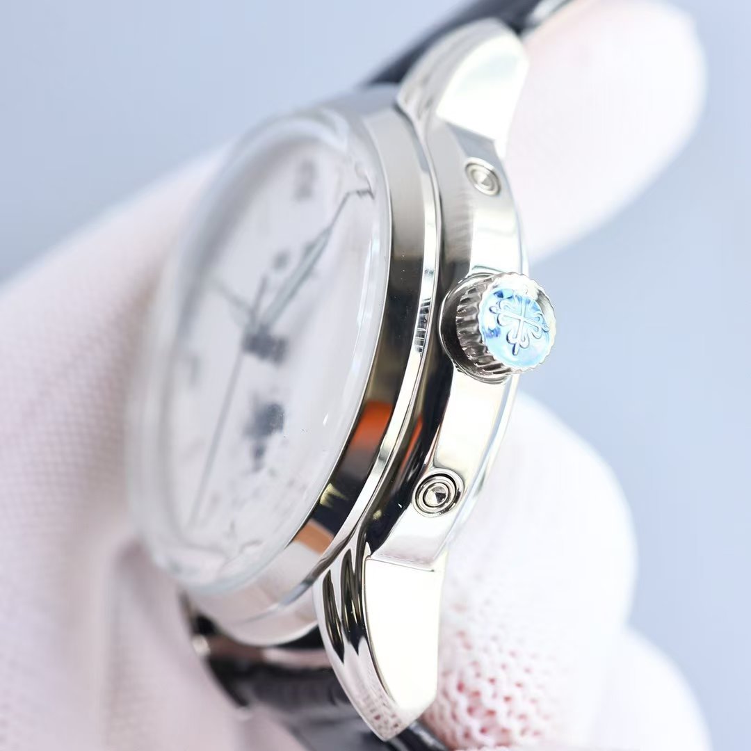 18kt white gold case with a shiny chocolate brown alligator leather strap. Fixed bezel. Lacquered cream dial with Arabic numeral hour markers. Dial Type: Analog. Luminescent hands and markers. Date display at the 6 o'clock position. Patek Philippe Calibre 324 S Q automatic movement with a min. 35-hour - max. 45-hour power reserve. Scratch resistant sapphire crystal. Transparent case back. Round case shape, case size: 40 mm, case thickness: 11.13 mm. Fold-over clasp. Water resistant at 30 meters / 100 feet. Functions: hour, minute, second, perpetual calendar with day/night indication, moonphase. Additional Info: 29 jewels, central rotor in 21k gold. Luxury watch style. Watch label: Swiss Made. Patek Philippe Grand Complications Lacquered Cream Dial Automatic Mens Perpetual Calendar Watch 5320G