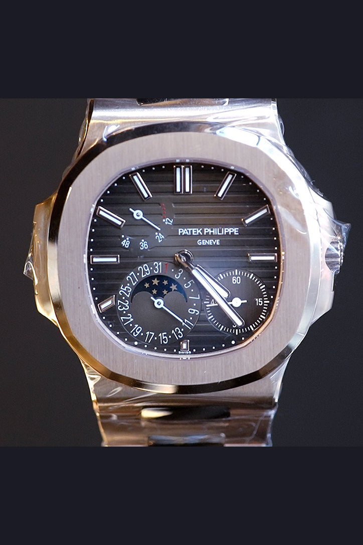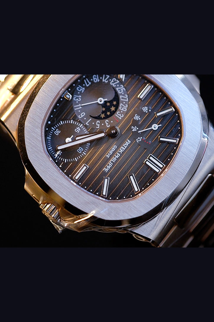 Patek Philippe Nautilus Moon Phase Rose Gold Watch 5712/1R-001 5712/1R Self-winding mechanical movement. Caliber 240 PS IRM C LU. Date by hand. Moon phases. Power reserve indication. Small seconds. Dial Sunburst brown, black-gradient rim, horizontally embossed, gold applied hour markers with luminescent coating. Case Rose gold. Screw-down crown. Sapphire crystal case back. Water-resistant to 60 m. Diameter (10–4 o’clock): 40 mm. Height: 8.52 mm.