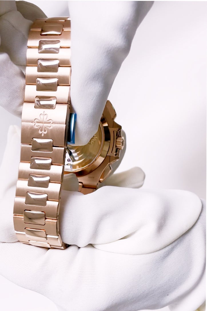 40.5mm 18K rose gold case, sapphire crystal back, black gradient dial with gold applied hour markers with luminescent coating, self-winding Caliber CH 28-520 C movement with date, chronograph, 60-minute and 12-hour monocounter at 6 o’clock, sweep seconds hand (chronograph hand), approximately 45-55 hours of power reserve, 18K rose gold bracelet Nautilus fold-over clasp. Water resistant to 120 meters. 5980/1R-001  5980-1R-001  5980/1R 2021 Update Butterfly clasp
