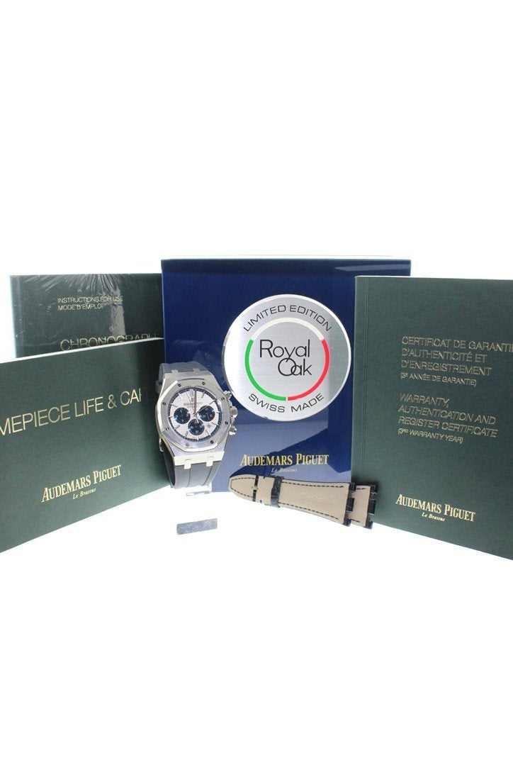 Stainless steel case with a blue rubber strap. Silver dial with silver-tone hands and index hour markers. Minute markers around the outer rim. Dial Type: Analog. Luminescent hands and markers. Date display between 4 and 5 o'clock position. Chronograph - sub-dials displaying: three - 60 second, 30 minute and 12 hours. Automatic movement. Calibre 2385 engine. Scratch resistant sapphire crystal. Screw down crown. Case diameter: 41 mm. Case thickness: 11 mm. Round case shape. Water resistant at 50 meters / 165 feet. Functions: chronograph, date, hour, minute, second. Additional Info: limited edition of 500 pieces. Luxury watch style. Watch label: Swiss Made. Audemars Piguet Royal Oak Silver Dial Automatic Mens Chronograph Watch 26326ST.OO.D027CA.01.