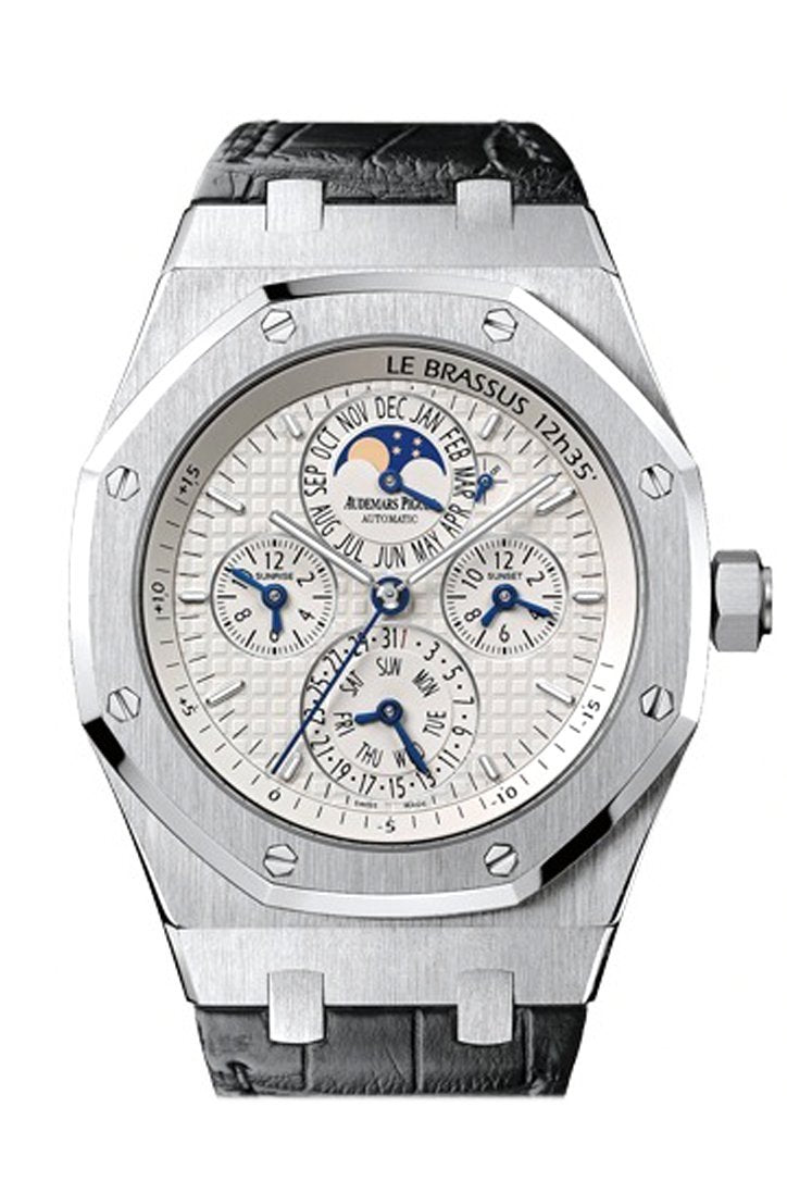39mm x 9.00mm stainless steel case, sapphire crystal back, screw-locked crown, glareproofed sapphire crystal, silver dial with Grande Tapisserie pattern, gold applied hour-markers with luminescent coating, and gold Royal Oak hands with luminescent coating , automatic-winding Audemars Piguet Calibre 2120/2808 movement with equation of time, sunrise and sunset times, and perpetual calendar with astronomical moon, approximately 40 hours of power reserve, hand-stitched large square scale black crocodile strap with stainless steel folding buckle. Water resistant to 20 meters.