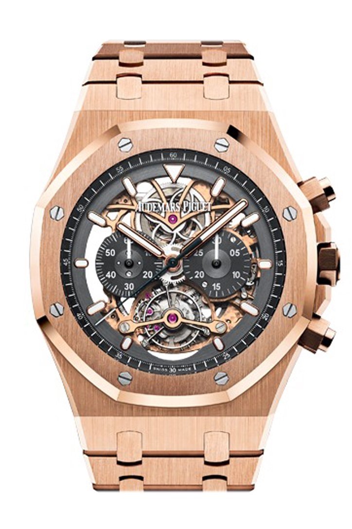 44MM 18-carat pink gold case, glareproofed sapphire crystal and caseback. Ruthenium-toned dial, openworked, satin-brushed, ruthenium-toned counters, pink gold applied hour-markers and Royal Oak hands with luminescent coating, ruthenium-toned inner bezel Dial. 18-carat pink gold bracelet with AP folding clasp. Additional grey alligator strap Bracelet Water resistant to 20 meters. 26347OR.OO.1205OR.01