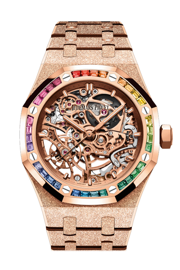 Audemars Piguet Royal Oak Frosted Gold Double Balance Wheel Openworked Rose Gold 37mm Rainbow Sapphire Watch 15468OR.YG.1259OR.01-B