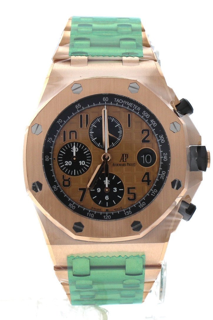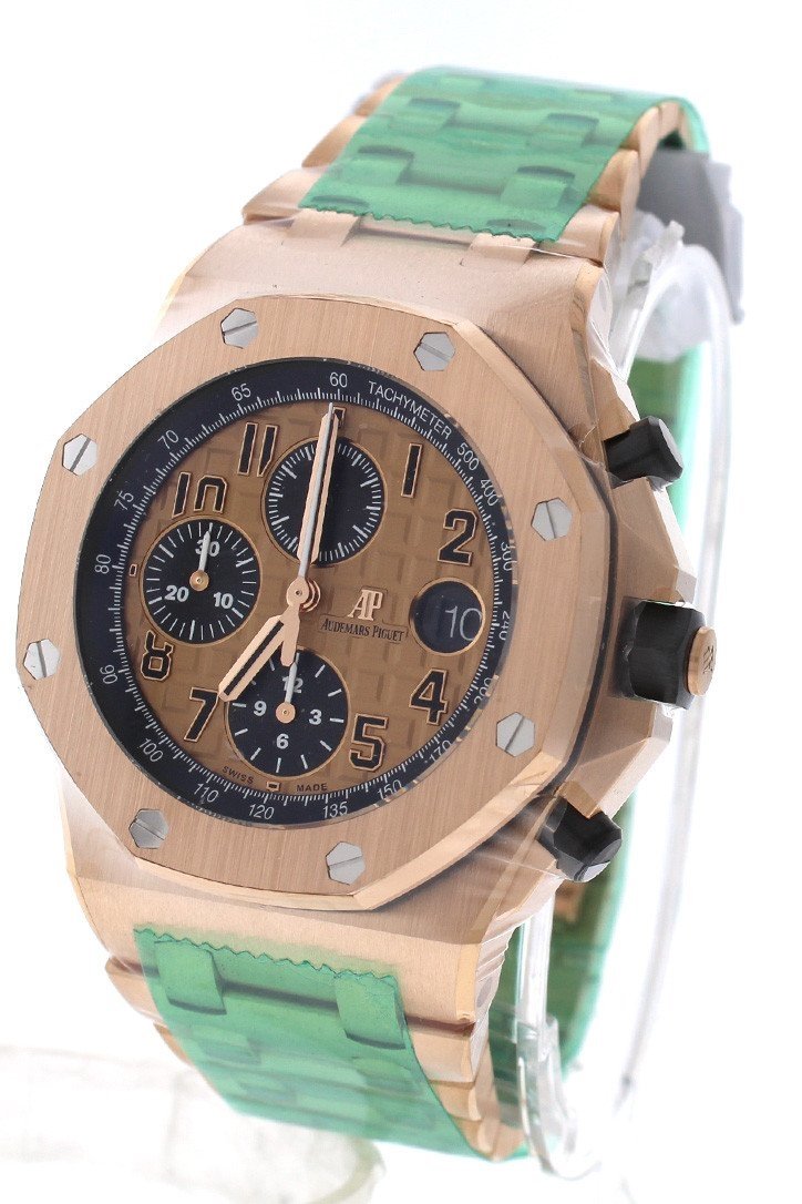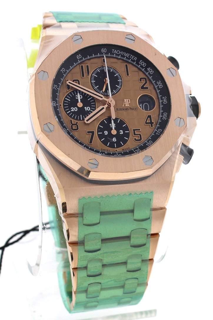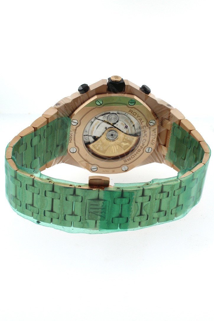18kt pink gold case with a 18kt pink gold bracelet. Fixed 18kt pink gold bezel.Rose dial with gold-toned hands and Arabic numeral hour markers. Tachymeter markings around the outer rim. Dial Type: Analog. Date display at the 3 o'clock position. Chronograph - three sub-dials displaying: 60 second, 30 minute and 12 hour. Automatic movement with a 50 hour power reserve. Scratch resistant sapphire crystal. Screw down crown. Transparent case back. Case diameter: 42 mm. Case thickness: 14.54 mm. Octagon case shape. Deployment clasp. Water resistant at 100 meters / 330 feet. Functions: chronograph, date, hour, minute, second. Luxury watch style. Watch label: Swiss Made. Audemars Piguet Champagne Dial 18kt Pink Gold Mens Watch 26470OR.OO.1000OR.01