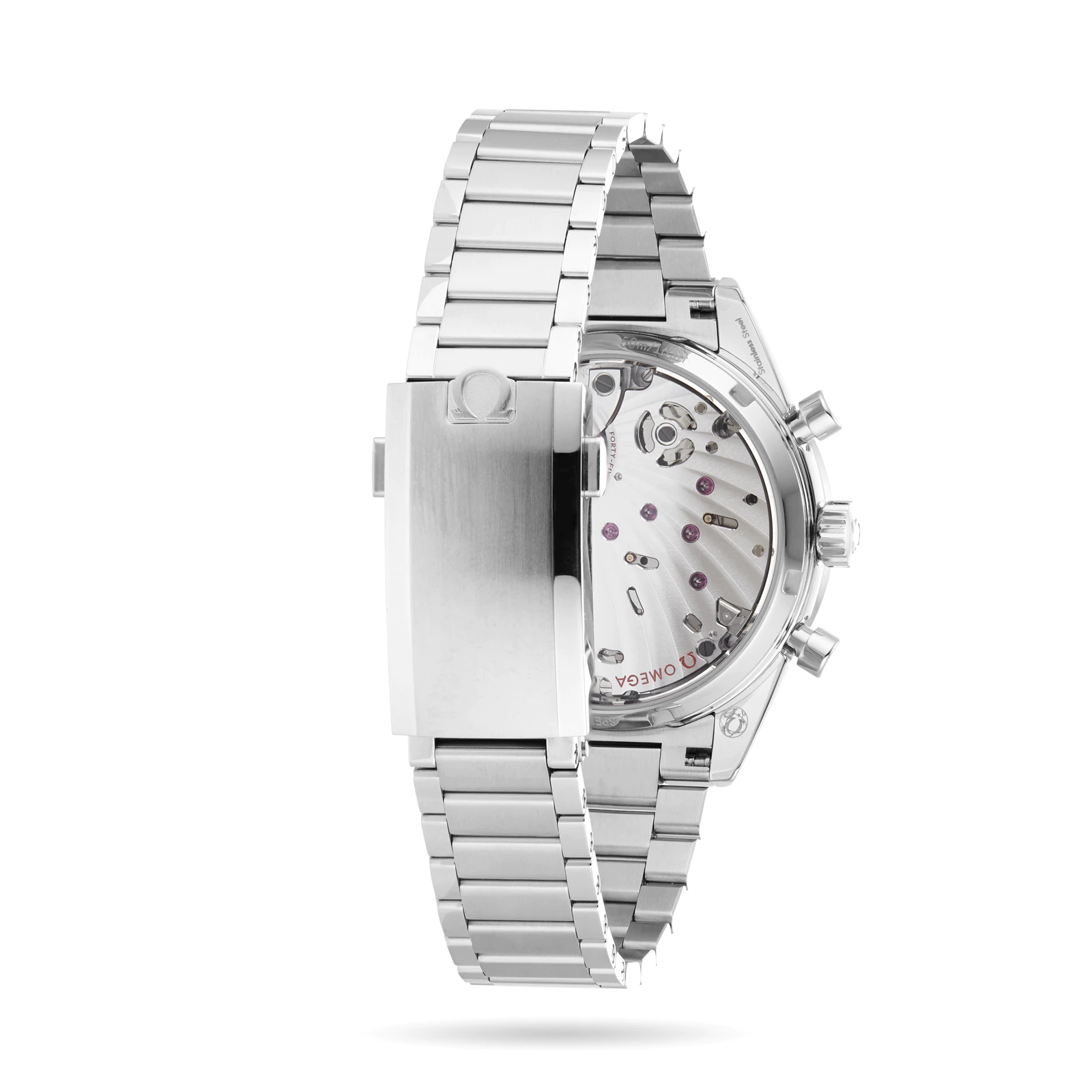Este modelo de acero sobre acero se inspira en el original y muestra con orgullo "Speedmaster '57" grabado en el fondo de la caja.