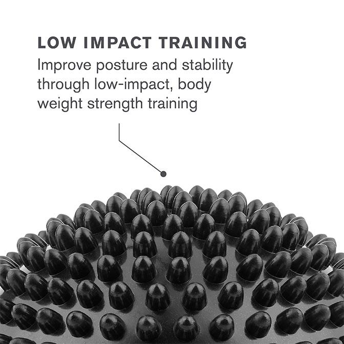 Designed to increase difficulty, improve stability, and strengthen core muscles, the Balance Pods can be used for a variety of static and dynamic movements. Use while on hands, knees, and feet during workouts that incorporate stability such as air squats, planks, or push-ups. The Balance Pods can help improve posture and stability through low impact, body weight strength training. Typically, low impact stability training creates less stress on the body than weight training, which can be an ideal training tool for developing fundamental skills required for other movements. The dual textured slip-resistant design creates two levels of difficulty and instability during movements. The pods are inflatable, lightweight and portable for use anywhere. Use at home or on-the-go, the Balance Pods are the perfect exercise accessory. An included travel pump lets you inflate wherever.