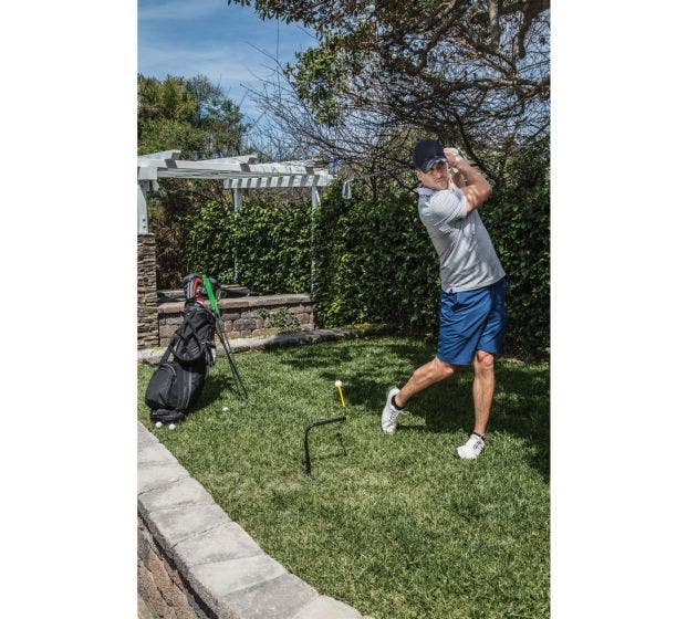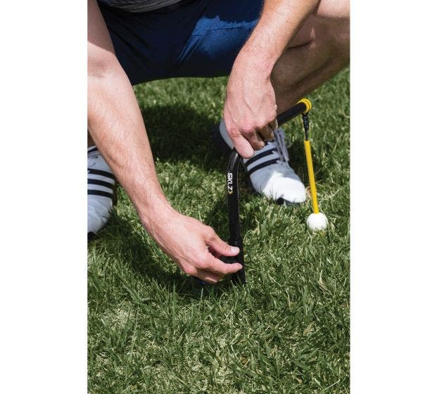 The SKLZ Pure Path is a must-have training tool to correct and perfect your golf swing. The aid provides you honest and instant feedback on your swing, while helping you eliminate slices and hooks. The attached target ball eliminates the need for a practice net and you'll never run out of golf balls and can be adjusted to different heights. Portable and lightweight, the Pure Path Swing Trainer sets up quickly and easily using stakes into the ground. The trainer can be hit with any wood, iron, or wedge club and is perfect for backyard training or on the range.
