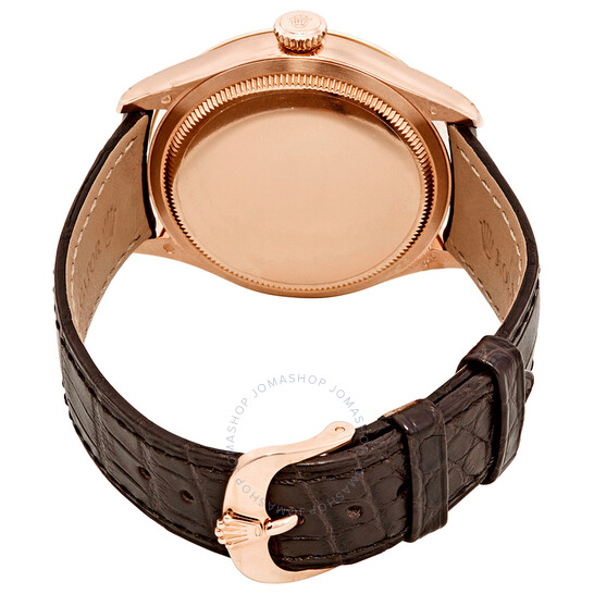 18kt everose gold case with a brown leather strap. Fixed 18kt everose gold bezel with diamond set. Black dial with rose gold-tone alpha-style shape hands and diamond-tipped index hour markers. Minute markers around an inner ring. Dial Type: Analog. Rolex Calibre 3132 Automatic movement, based upon Rolex 3130, containing 31 Jewels, bitting at 28800 vph, and has a power reserve of approximately 48 hours. Scratch resistant domed sapphire crystal crystal. Screw down crown. Solid case back. Round case shape, case size: 39 mm. Tang clasp. Water resistant at 50 meters / 165 feet. Functions: hour, minute, second. Cellini Time Series. Luxury watch style. Watch label: Swiss Made. Rolex Cellini Time Black Diamond Dial Automatic Men’s Leather Watch 50705BKDL.