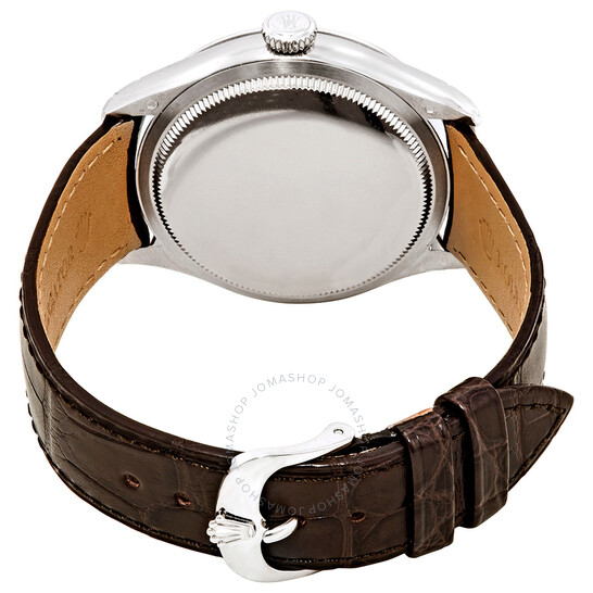 18kt white gold case with a brown alligator leather strap. Fixed 18kt everose gold bezel with diamond set. Black dial with white gold alpha-style shape hands and diamond-tipped index hour markers. Minute markers around an inner ring. Dial Type: Analog. Rolex Calibre 3132 Automatic movement, based upon Rolex 3130, containing 31 Jewels, bitting at 28800 vph, and has a power reserve of approximately 48 hours. Scratch resistant domed sapphire crystal crystal. Screw down crown. Solid case back. Round case shape, case size: 39 mm. Tang clasp. Water resistant at 50 meters / 165 feet. Functions: hour, minute, second. Cellini Time Series. Luxury watch style. Watch label: Swiss Made. Rolex Cellini Time Black Diamond Dial Ladies Alligator Leather Watch 50709BKDL.