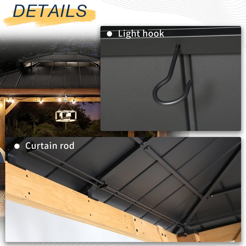COZYWOR wood gazebo is sturdy and stable. It is the best choice for your patio. The wood gazebo is designed with 2-tier for optimum ventilation. And there is a hook on the top, which you can hang a chandelier to decorate. Also, it is made from solid wood. It is weather resistant. It can provide you with a place where you can take a party and relax. And it is with curtain rail you can hang a curtain or mosquito netting (curtain or mosquito netting is not included). Providing a private place for you. Enjoy your outdoor living.