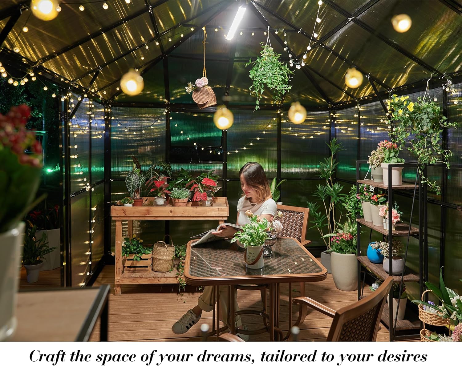 - 【Versatile Space】850 cu. Ft. to create a perfect warm environment for your personal plants. Transform your polycarbonate greenhouse into a functional living space by adding furniture. Exclusive design patent & a spear-like top discourages bird perching.
