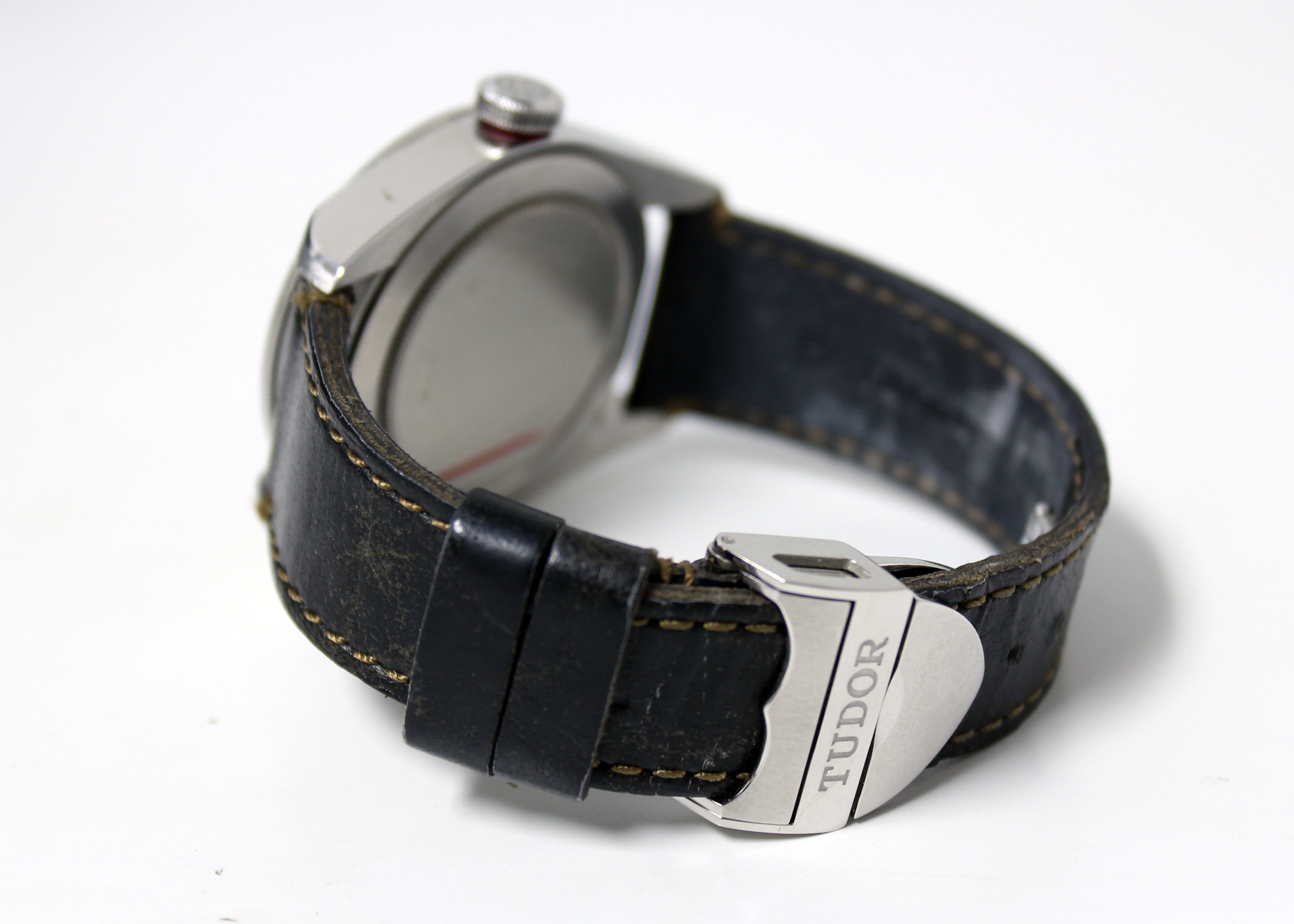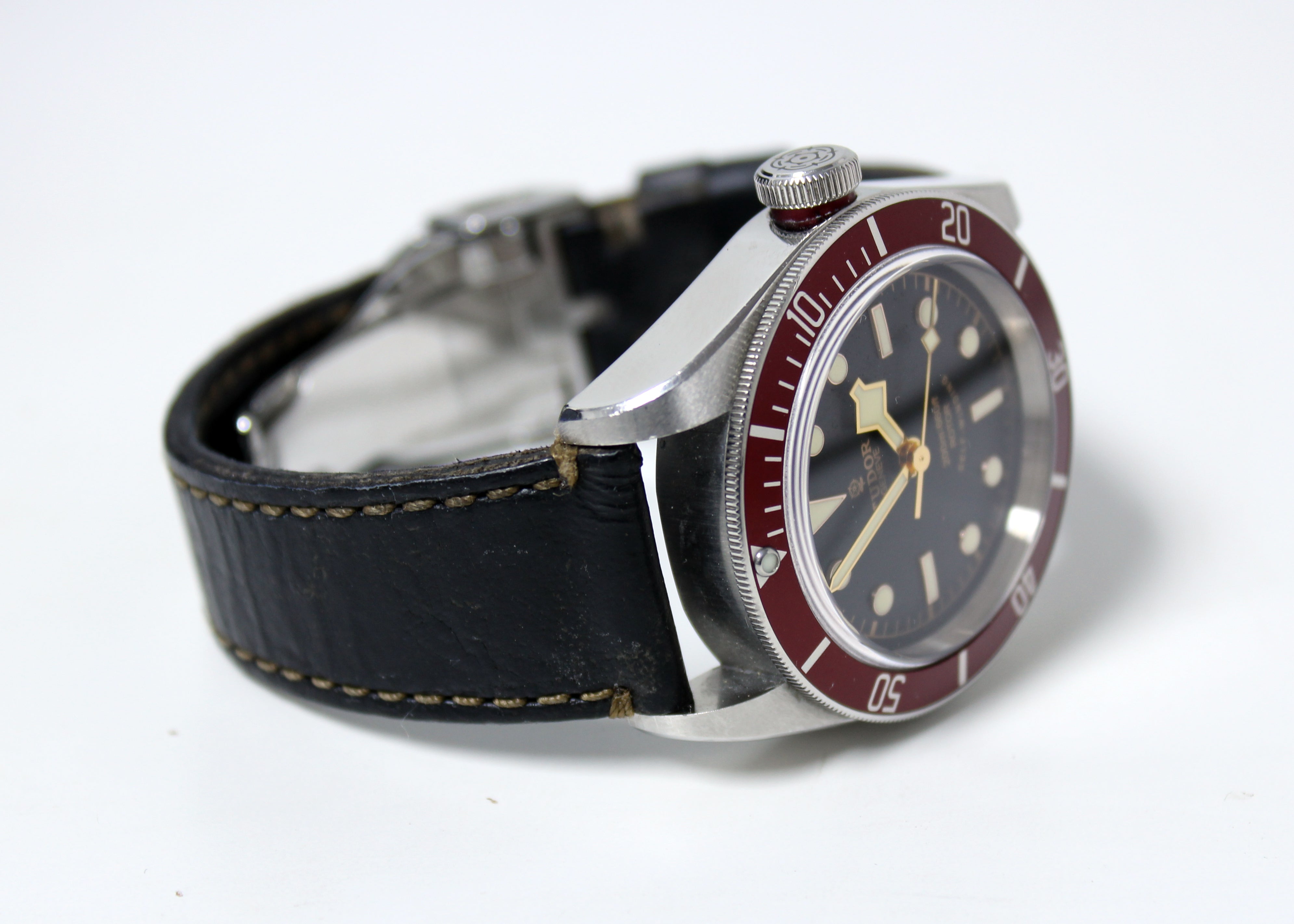 Stainless steel case with a dark brown (aged) leather strap. Uni-directional rotating stainless steel bezel with a red top ring. Black dial with luminous gold-tone hands and dot hour markers. Minute markers around the outer rim. Dial Type: Analog. Luminescent hands and markers. Tudor calibre MT5602 automatic movement with a 70-hour power reserve. Scratch resistant sapphire crystal. Screw down crown. Solid case back. Round case shape. Case size: 41 mm. Band width: 22 mm. Fold over clasp. Water resistant at 200 meters / 660 feet. Functions: hour, minute, second, chronometer. Luxury watch style. Watch label: Swiss Made.