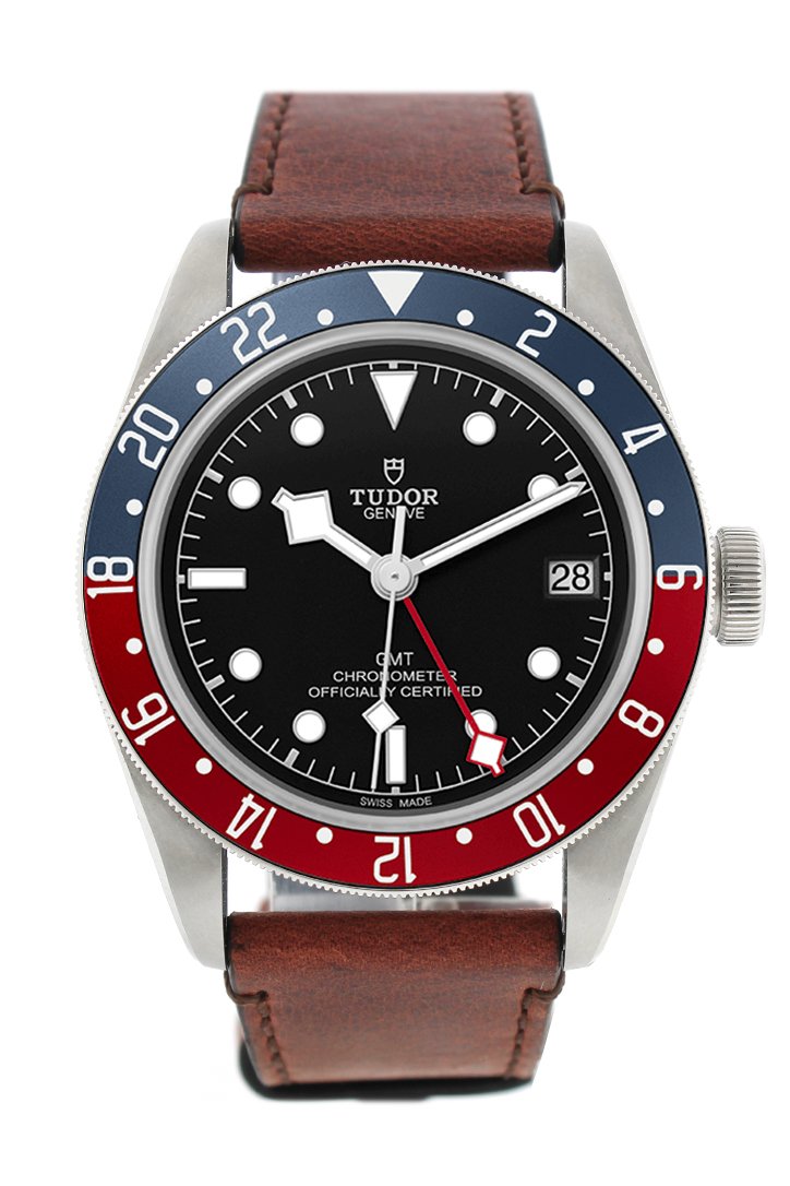Silver-tone stainless steel case with a brown leather strap. Bi-directional rotating burgundy and blue bezel. Black dial with silver-tone hands and dot hour markers. Dial Type: Analog. Date display at the 3 o'clock position. Tudor Calibre MT5652 automatic movement with a 70-hour power reserve. Scratch resistant sapphire crystal. Screw down crown. Round case shape. Case size: 41 mm. Water resistant at 200 meters / 660 feet. Functions: GMT, second time zone, hour, minute, second, date. Watch label: Swiss Made. Tudor Black Bay Automatic Black Dial Men's GMT Brown Leather Watch