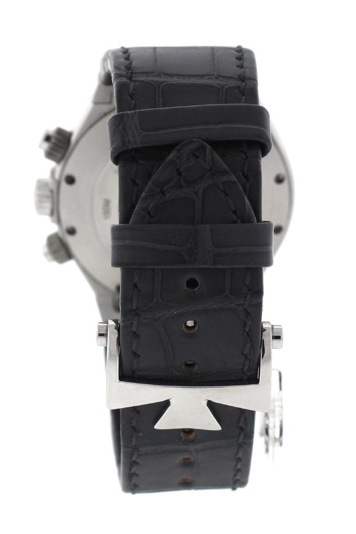 42mm stainless steel case, titanium bezel, screwed-down pushpieces and crown, anthracite dial, self-winding 1137 movement with hours, minutes, small second, calendar in aperture, and chronograph with 30-minute and 12-hour counters, approximately 40 hours of power reserve, Mississippi alligator strap with folding buckle. Water resistant to 150 meters.