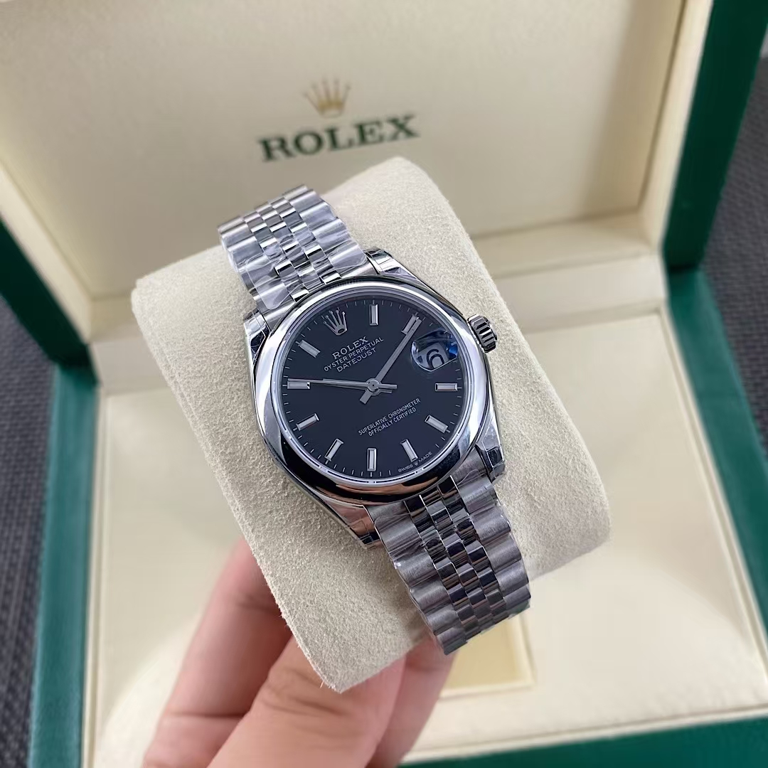 Silver-tone stainless steel case with a silver-tone stainless steel rolex jubilee bracelet. Fixed- domed silver-tone bezel. Black dial with silver-tone hands and index hour markers. Minute markers around the outer rim. Dial Type: Analog. Luminescent hands and markers. Date display at the 3 o'clock position. Rolex Calibre 3235 automatic movement with a 70-hour power reserve. Scratch resistant sapphire crystal. Screw down crown. Solid case back. Round case shape. Case size: 36 mm. Folding oyster clasp. Water resistant at 100 meters / 330 feet. Functions: date, hour, minute, second, chronometer. Luxury watch style. Swiss Made. Rolex Datejust 36 Automatic Black Dial Mens Jubilee Watch